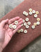 Four-hole buttons in off-white with chips of recycled mother of pearl. The mother of pearl used in these buttons is repurposed from waste for a beautiful pearlescent effect.